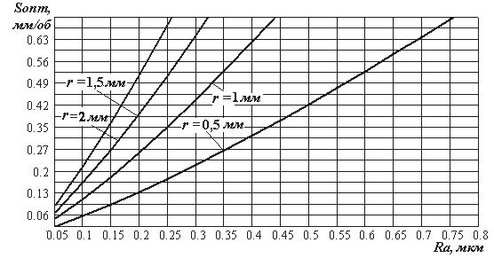 Графики зависимости оптимальной подачи Sопт от шероховатости поверхности Ra при комбинированной лезвийной и отделочно-упрочняющей обработке конструкционной стали для различных значений радиуса при вершине резца r приведены на рис. 2.