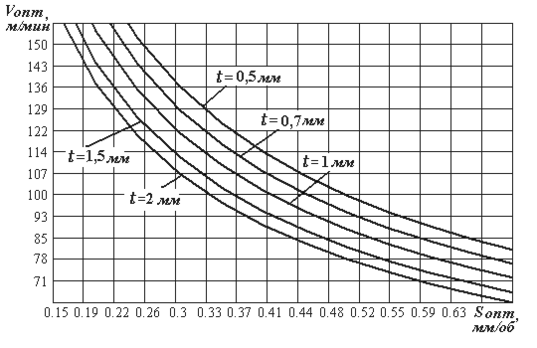Рисунок 3 - Графики зависимости оптимальной скорости Vопт от оптимальной подачи Sопт при комбинированной обработке для различных значений глубины резания t