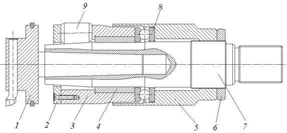 Инструмент состоит из следующих основных элементов: расточной головки 1, раскатных роликов 9, оправки 7, корпуса 5. Расточная головка 1 устанавливается в отверстие оправки 7 с помощью конуса Морзе. Раскатные ролики 9, установленные на оправке 7, расположены равномерно по окружности в сепараторе 3. Опорой для роликов служит конус на оправке 7. Для уменьшения трения сепаратора об оправку и исключения возможности задиров установлена втулка 4. Осевое смещение сепаратора 3 ограничено с одной стороны втулкой 4, с другой стороны крышкой 2. В корпусе 5 установлены подшипники 10, воспринимающие основные усилия при обработке. Для обработки отверстия диаметром 80мм рекомендуется применять упорный подшипник 8110 [1]. Корпус 5 устанавливается на оправке 7 гайкой 6. Установка раскатки на размер осуществляется регулировочной гайкой 8.