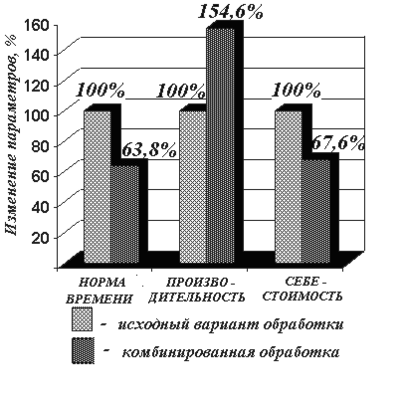 На рис. 4 приведены сравнительные данные по изменению параметров экономической эффективности за счёт применения комбинированной обработки трубы гидростойки совместным растачиванием и раскатыванием вместо последовательной обработки.