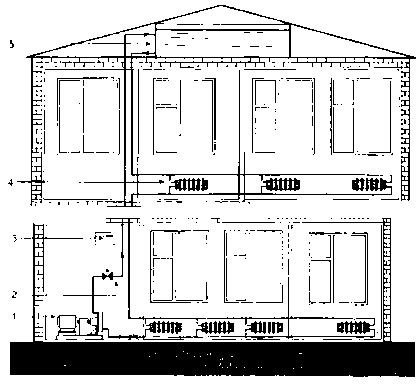 Рис.3. Схема локального отопления здания. 1-теплогенератор, 2-циркуляционный насос, 3- пульт управления, 4- батареи водяного отопления, 5- бак-накопитель горячей воды.