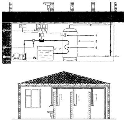 Рис.4. Схема горячего водоснабжения душевой. 1-теплогенератор, 2-циркуляционный насос, 3- пульт управления, 4- датчик температуры, 5- бойлер-теплообменник , 6- первичный контур теплообменника, 7- бак первичного контура.