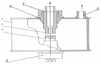 В основу установки нагрева жидкости положен гидродинамический излучатель, который превращает энергию турбулентной затопленной струи жидкости в тепловую энергию, нагревая жидкость. Конструктивная схема гидродинамического излучателя представлена на рис. 2. Наиболее целесообразным является механизм гидродинамического излучения за счет пульсации кавитационной области, которая образуется между соплом 2 и препятствием 3 (рис. 2).