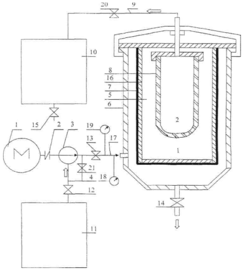 Масло (вихідна сировина) з зовнішньої ємності 21 передається до відкритого крану 15 та потрапляє у всасуючу магістраль насосу 1, нагнітаюча магістраль якого з’єднана з колектором 2. Колектор 2 містить запірно-регулюючий клапан, через кран 10 олія потрапляє до випромінювача 8, кран 11 зєднаний з дегазатором 7, кран 12 підключає блок фільтрів 9, кран 13 подає олію до нагнітателя 3, а кран 14 зєднаний з центрифугою 4.
