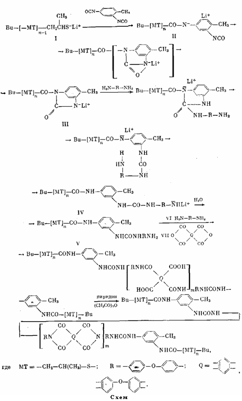 Однако дальнейшее взаимодействие продукта реакции с ДАДФЭ и последующее образование блок-сополимеров доказывает, что вторая изоцианатная группа ТДИ остается реакционноспособной. Это кажущееся противоречие заставило предположить возможность протекания реакции "живого" ОМТ с ТДИ с образованием продукта внутримолекулярной циклизации в молекуле ТДИ (схема, III). Правомочность подобного предположения подтверждается данными работы [10], в которой показано, что при полимеризации алифатических диизоцианатов под влиянием нуклеофильных агентов образуются линейные растворимые полимеры с повторяющимися циклическими звеньями в цепи.