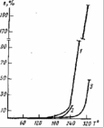 Метилтииранимидные блок-сополимеры были получены химической имидизацией пленки [15] метилтииранамидокислотного блок-сополимера. Как показывают данные рис.3, присоединение гибкого метилтииранового фрагмента к концам полиимидной цепи сообщило полимеру пластические свойства. Обрыв пленки метилтииранимидного блок-сополимера происходит при удлинении более 200% (рис.3), в то время как обрыв гомополиимидной пленки, полученной в аналогичных условиях, наступает при удлинении ~16% (рис.3). При исследовании пленки метилтииранимидного блок-сополимера, предварительно прогретой до 320°, обрыв происходит при удлинении уже не 200, а ~50%, а температура размягчения повышается с 210 до 270°. Эти результаты согласуются с данными ТГА, где 20% -ная потеря в весе при 250-300° обусловлена термодеструкцией метилтиирановых блоков. Следовательно, при предварительном прогревании пленки выше 250° происходит выгорание блоков метилтиирана и, как следствие, падение термопластичности исследуемого материала. Кроме того, известно, что при химической имидизации частично образуются изоимидные циклы, изомеризующиеся в имидные при нагревании до 300° [16]. Следовательно, повышение температуры размягчения до 270° (Тр "термического" ПИ-ДФО [17]) после предварительного прогревания пленки блок-сополимера обусловлено отсутствием в полиимиде изоимидных структур. Таким образом, прогревание метилтииранимидного блок-сополимера приводит к структуре "термического" полиимида.
