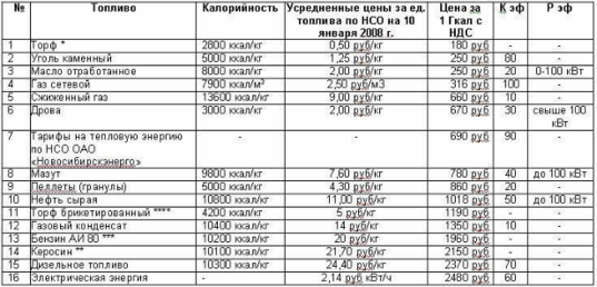 Сравним стоимость отопления здания объемом 18 -20 тысяч кубических метров при отоплении газом, электричеством и дизельным топливом на примере Новосибирска. Стоимость энергоносителей приведена в Таблице 1. (цены на 1 января 2008 г., http://www.ooofarta.ru/).