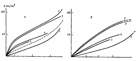 Рис.5. Кривые напряжение - деформация в обычных координатах (а) и в координатах уравнения (1) (б). Штриховая линия - для чистого полиуретана.