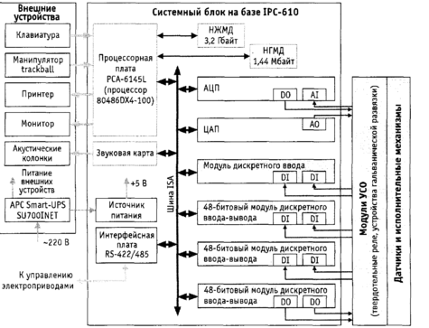Вычислительный комплекс системы реализован на 1ВМ РС совместимом промышленном компьютере фирмы Advantech. В 14-слотовом шасси IРС-610 размещены основные элементы системного блока и устройств связи с объектом (УСО). На рисунке 1.3 приведена структурная схема вычислительного комплекса.
