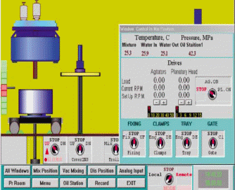 наиболее важные для данной операции параметры индицируются на виртуальной панели; в верхней части правого активного окна видно, что в текущий момент времени температура смеси равна 25,3°С, подводящей воды 25,9°С, отводящей воды 25. ГС, давление в гидросистеме 42,3 МПа, приводы мешалки и водила остановлены (о чем свидетельствуют как переключатель "АG. ON-РL. ОN", так и красный цвет самой надписи "SТОР"); по положениям остальных переключателей "F1Х-ING", "СLАМРS", "ТRАУ", "GАТЕ" легко определить истинное состояние оборудования (в данном случае никаких активных действий не производится, так как все переключатели находятся в положении "SТОР"). Практический опыт работы по управлению установкой показал, что даже неподготовленный оператор после 3-4 часов работы вполне удовлетворительно справляется с виртуальной панелью управления, которая на первый взгляд кажется не очень понятной.
