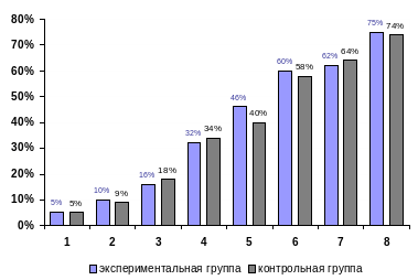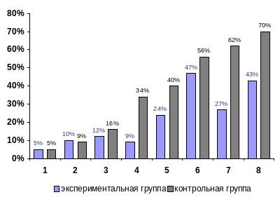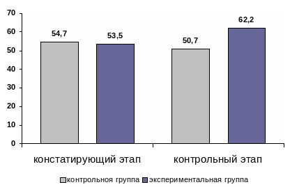 Уровневый и количественный анализ продуктивности психической деятельности детей с церебральным параличом, показывает качественные изменения процессов пространственного анализа и синтеза, развитие которых достоверно выше у детей экспериментальной группы, чем те же показатели у детей контрольной группы. Общий коэффициент продуктивности выполнения тестовых проб для экспериментальной группы составил: Кпр.= 62,2; в контрольной группе: Кпр.= 50,7.