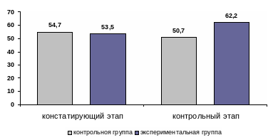 Таким образом, уровневый и количественный анализ продуктивности психической деятельности детей с церебральным параличом, показывает качественные изменения процессов пространственного анализа и синтеза, развитие которых достоверно выше (p > 0.05) у детей экспериментальной группы, чем те же показатели у детей контрольной группы. Общий коэффициент продуктивности выполнения тестовых проб для экспериментальной группы составил: Кпр.= 62,2; в контрольной группе: Кпр.= 50,7. Указанные результаты графически представлены в диаграмме №6.