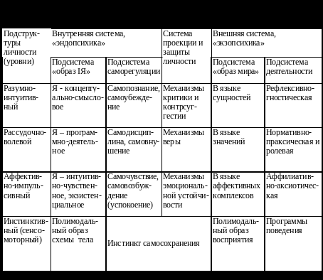 Необходимо отметить, что сформулированная нами концепция явным образом не соотносится с такими «личностными» категориями, как темперамент, характер, способности, направленность (см., например, А.Г. Ковалев, 1970). Эти понятия не имеют строгих определений и насыщаются содержанием в зависимости от теоретических взглядов и субъективных предпочтений авторов, их использующих. Первым по значимости причинным фактором активности и развития личности является многоуровневый аутодиалог, первоначально формирующийся по механизму интериоризации, а затем, по мере созревания личности, все более автономный, менее зависимый от внешних воздействий. Этот диалог выполняет функцию внутреннего генератора проблем и самопрограммирования, существенно влияет на формирование образа мира и системы внешней деятельности, в значительной степени определяет судьбу конкретного индивида. Взаимосвязь внутренней и внешней вертикальных систем личности не является непосредственной. Она опосредуется третьей системой, которую мы назвали системой проекции и защиты личности. Функция этой своеобразной «мембраны» также двусторонняя.