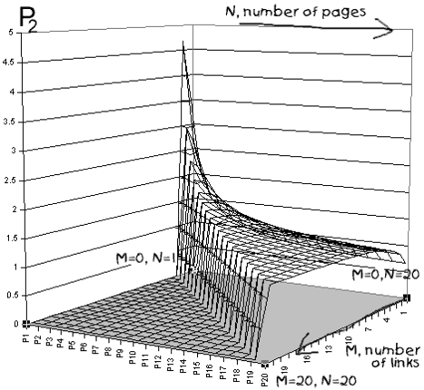 Видно, что самый быстрый рост P1 происходит при увеличении числа страниц происходит при отсутствии ссылок между второстепенными страницами (M=0). При наличии нескольких ссылок возрастание P1 становится медленным. Если рассматривать изменение P1 при фиксированном количестве страниц N (например, N=20), видно, что при увеличении числа ссылок M происходит резкое уменьшение PageRank главной страницы.