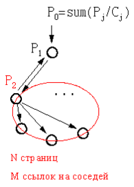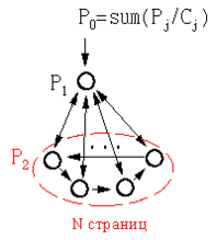 | Система уравнений: P1=0.15+0.85*(P0+N*P2/N) - на страницу вида 1 ссылаются N страниц вида 2, на каждой из которых N ссылок (N-1 на соседей и одна на страницу 1) P2=0.15+0.85*(P1/N+(N-1)*P2/N) - на страницу вида 2 ссылается одна страница вида 1, на которй N ссылок; и N-1 страниц вида 2, на каждой из которых N ссылок |