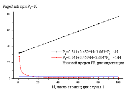 Судя по формуле, можно получить любое значение PageRank главной страницы только за счет увеличения количества страниц, ведь P1 линейно увеличивается при увеличении N. При этом все страницы сайта должны быть проиндексированы Google. Однако, вспомним о том, что существует минимальное значение PR, достичь которого необходимо для индексации документа Google. Но ведь PageRank второстепенных страниц (P2) уменьшается с N! Посмотрим на график: