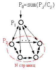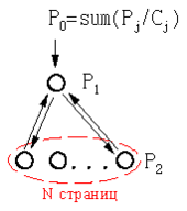 | Система уравнений: (N>=2) P1=0.15+0.85*(P0+N*P2/2) - на страницу вида 1 ссылаются N страниц вида 2, на каждой из которых 2 ссылки P2=0.15+0.85*(P1/N+P2/2) - на страницу вида 2 ссылается одна страница вида 1, на которй N ссылок; и одна страница вида 2, на которой 2 ссылки |