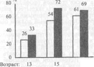 Рис. 1. Удовлетворение сексуальной потребности путём мастурбации в возрастных группах: 13, 15 и 18 лет (светлым - лица женского, темным - мужского пола)
