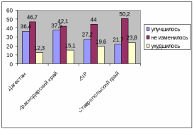 О приоритете проблемы материального обеспечения для населения Юга России свидетельствует анализ ответов на вопрос «К какому слою населения Вы себя относите?». Результаты анализа, приведенные в таблице 5, показывают, что относительное большинство респондентов (46%) позиционируют себя как представителей низкообеспеченного слоя населения. В Ставропольском крае и КЧР данная категория ответов численно выше, чем в Краснодарском крае и Дагестане.