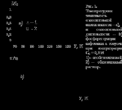 При концентрациях нафталина 0.3 М (рис.1) в области от 77 до 110 К тушение обусловлено наличием кислорода в растворе. Поскольку данный вид тушения существует при одновременном наличии кислорода и миграции возбуждений по триплетным уровням нафталина, можно утверждать, что причиной тушения в области 77-110 К является миграционно-ускоренное тушение возбуждений на молекулах кислорода. При этом константа скорости миграционно-ускоренного тушения увеличивается с ростом температуры. Ее можно вычислить из результатов кинетических экспериментов: