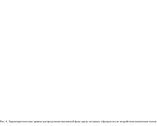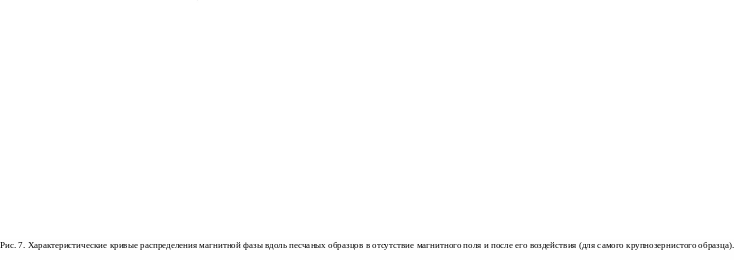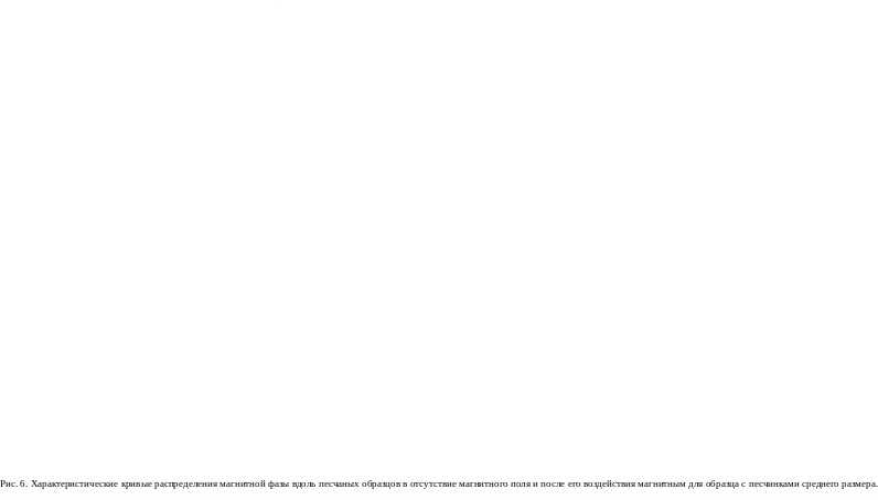 На рисунке 3 графически представлены результаты экспериментов, проведённых для трёх песчаных образцов с различным размером песчинок (различного уровня пористости) в отсутствии внешнего магнитного поля после пятнадцати минут пребывания нижнего конца трубки в резервуаре с магнитной жидкостью. На рисунке 4 показаны результаты, полученные после пятнадцатиминутного пребывания образца в неоднородном магнитном поле. На рисунках 5, 6 и 7 представлены те же результаты для каждого образца в отдельности.