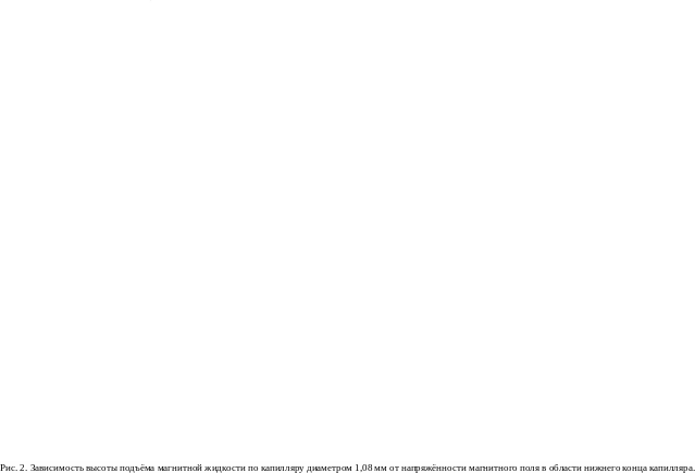 эксперименте исследовалась зависимость уровня подъёма магнитной жидкости по капилляру от величины напряжённости магнитного поля в области нижнего конца капилляра. Использовались образцы МЖ с объёмной концентрацией магнетита от 2 до 16 % при их подъёме по цилиндрическим капиллярам диаметром 0,27, 1,08 и 1,28 мм. Измерения диаметров осуществлялось посредством оптического микроскопа «Биолам» с ошибкой не более 0,01 мм. Результаты измерений графически представлены на рисунках 1 и 2.