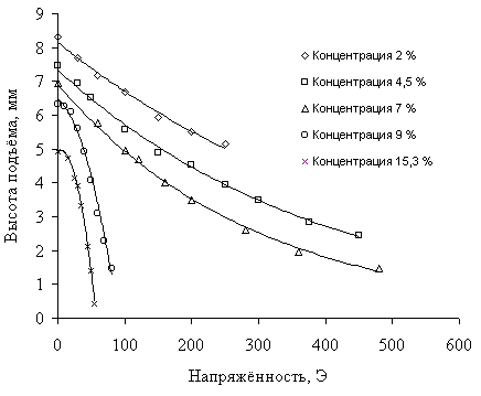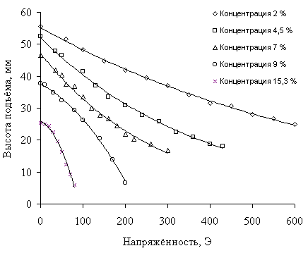 Для изучения зависимости капиллярного подъёма от величины внешнего магнитного поля между полюсами электромагнита, способного создавать в пространстве неоднородное магнитное поле с известным градиентом напряжённости, помещался резервуар с исследуемой жидкостью. Вдоль направления, перпендикулярного оси симметрии полюсных наконечников, располагался стеклянный капилляр круглого сечения так, что его нижний конец едва касался свободной поверхности МЖ в кювете. Во избежание нежелательного перегрева МЖ катушками электромагнита кювета термоизолировалась от них пенопластовой оболочкой. Подъём магнитной жидкости вдоль оси капилляра измерялся катетометром.