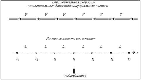 Пусть в некоторой инерциальной системе покоится источник, который излучает световые импульсы через равные промежутки времени Т. В инерциальной системе отсчета, где находится неподвижный наблюдатель, этот источник будет двигаться относительно наблюдателя с некоторой постоянной скоростью вдоль оси х. Поскольку относительная скорость инерциальных систем отсчета постоянна, неподвижный наблюдатель будет видеть вспышки, причем точки вспышек будут располагаться на равном расстоянии L друг от друга. Измеряя время между соседними вспышками (tn – tn-1), и зная, что расстояние между ними равно L, он может вычислить скорость для различных участков оси х.