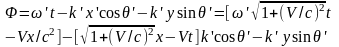 Как мы уже говорили, истинные скаляры («сущности») остаются инвариантными в любой инерциальной системе отсчета. Таким инвариантом является фаза волны, регистрируемая наблюдателем. Для монохроматического сигнала в системе отсчета наблюдателя, когда наблюдатель движется относительно источника в плоскости (x’; y’) мы можем записать