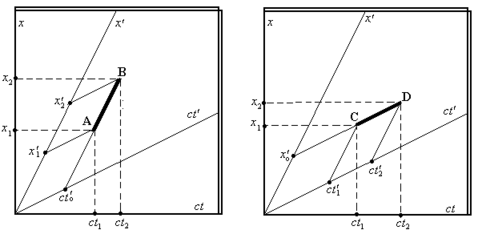 Аналогичные явления имеют место, когда мы рассматриваем интервал времени. Если в неподвижной точке x’0 на короткое время t’1 – t’2 вспыхивает лампочка, интервал времени (отрезок CD на правом фрагменте рис. 3), то движущийся наблюдатель обнаружит, что светящаяся точка перемещается в пространстве от х1 к точке х2 за время ct1 – ct2. Но это время перемещения не есть действительный «интервал времени», наблюдаемый в движущейся системе. Это проекция.