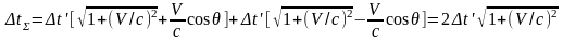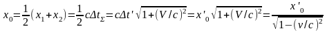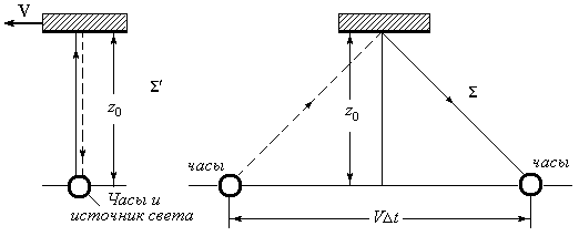 Время прямого прохождения от часов к зеркалу в собственной системе отсчета источника излучения (сплошная линия на левой фигуре рис. 6) равно