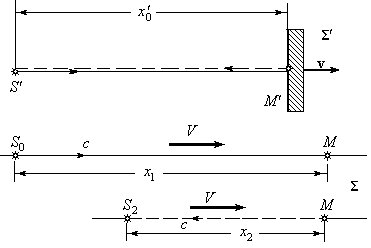 Предварительное замечание. Световой луч, достигнув движущейся поверхности, отражается от нее. Точка отражения становится новым (вторичным) источником светового сигнала. В силу этого в системе отсчета