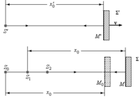 есть расстояние x0 между его концами, наблюденными «одновременно» в том смысле, как определялось выше. Чтобы избавиться от расчетов, связанных с одновременностью, рассмотрим следующее событие: пусть источник света S’, расположенный на одном конце стержня, посылает световой импульс к другому концу, где расположено зеркало M’; отразившись от зеркала, световой импульс возвращается к источнику.