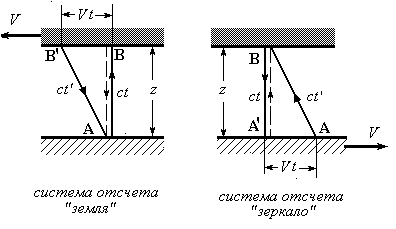 Рассмотрим систему отсчета, связанную с наблюдателем («земля »). Луч, идущий от А к В, не искажен, т.к. его источник неподвижен. Отраженный от зеркала луч имеет своим источником точку зеркала В. Следовательно, обозначенное пунктиром расстояние ВА (рис.3), будет наблюдаемым расстоянием, фиксируемым в момент приема луча в точке А. Поскольку точка В движется, действительное расстояние в момент приема сигнала в точке А будет равно В’А. Если учесть это обстоятельство, то полный путь луча равен сумме отрезков АВ и В’А (сплошные линии на рис. 3), но никак не 2АВ = 2z! А время, затраченное на этот путь, равно отношению найденного пути к скорости света.