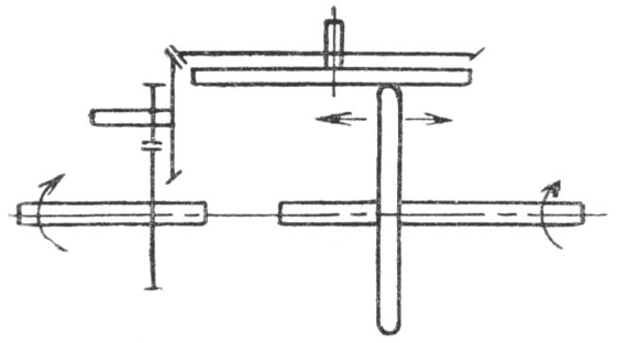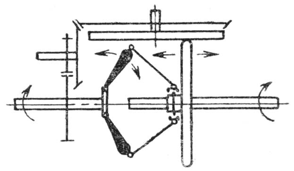 Сформулируем модель задачи для подсистемы управления передаточным отношением: использовать энергопоток уже имеющий необходимую пространственно-временную организацию, а именно – ведущий (входной) вал. На него надо навесить центробежный регулятор и двигать с его помощью ведомый фрикционный диск ( рис. 1г ).