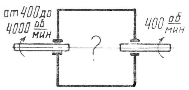 Задача. Ведущий вал вращается со скоростью от 400 до 4000 об/мин. Ведомый вал должен постоянно иметь 400 об/мин. Как это осуществить? (рис.1)