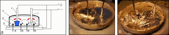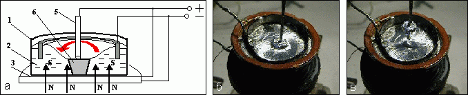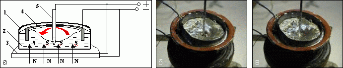 Вихревое движение жидкости в магнитном поле сопровождается температурным эффектом. Сущность его состоит в том, что в вихревой среде возникает градиент температуры. Повышение температуры среды у одного электрода сопровождается понижением температуры среды у другого электрода. Описание эффекта приведем на примере электропроводной жидкости. Кювету с электропроводной жидкостью помещают в магнитное поле, вектор индукции которого направлен вертикально. В центральной части кюветы в жидкость опущен электрод. Второй периферийный электрод выполнен кольцевым и установлен по периметру кюветы (рис.13а). При протекании тока наблюдается вихревое движение жидкости, которое сопровождается повышением температуры среды у одного электрода и понижением температуры среды у другого электрода. Это проявляется в эксперименте как образование твердой фазы металла у одного из электродов (рис.13б и 13в). При изменении условий эксперимента твердая фаза образуется не в центральной области, а у периферийного электрода.