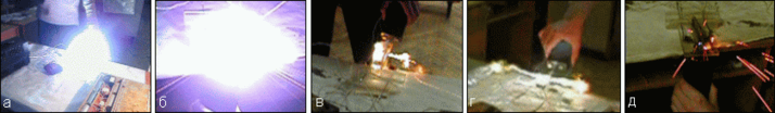 На некотором расстоянии от плазмообразующего канала, вне зоны генерации плазмы, мы помещали мишени. В качестве мишеней выступали листы бумаги, картона и металлов. На третьем кадре (рис.16в) видно фрактальное плазменное образование свободно двигающееся в воздухе. Кроме того, на этом кадре видно некое образование, имеющее красноватый оттенок, зависшее у края стола, на котором расположена установка. На четвертом кадре (рис.16г) видны сразу оба конусных плазменных образования. В этом эксперименте мишени не устанавливались. Рисунок 16д изображает финальную стадию существования плазмы. На нем видны разлетающиеся расплавленные фрагменты мишени.