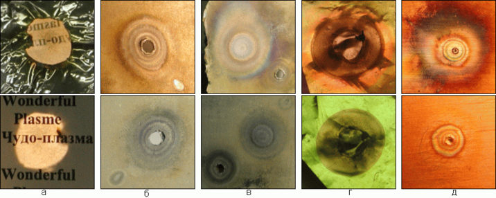 По определению плазмой считается ионизированный газ, в котором плотности пространственных зарядов, созданных положительно и отрицательно заряженными частицами, одинаковы или почти одинаковы (квазинейтральность), а хаотическое тепловое движение этих частиц преобладает над их направленным перемещением под действием внешнего электрического поля [22]. Результаты наших экспериментов показывают некоторые особенности плазмы. Мы пришли к выводу, что в плазме, генерируемой нашей установкой, хаотическое тепловое движение практически отсутствует, в результате чего у плазмы наблюдается четкая, регулярная, фрактальная структура в виде вложенных конусов. Это подтверждают результаты осмотра образцов материалов, служивших мишенью для плазмы. На рисунке 18 показаны лицевая и обратная стороны пяти различных мишеней после воздействия на них плазмой. В первом столбце (рис. 18а) находятся изображения упомянутого выше комплекса, состоящего из алюминиевой фольги и полоски писчей бумаги. Во втором – (рис.18б) расположены фотографии отверстия, образовавшегося в вольфраме. На них отчетливо видны структуры, образованные чередующимися светлыми и темными кольцами. Температура плавления вольфрама – 3370С, температура кипения – 5900С.