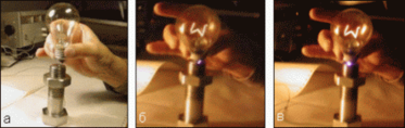 Рис. 11. Фотографии экспериментов, демонстрирующие свечение лампы накаливания в руке.