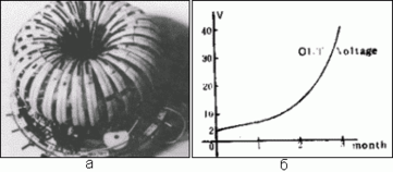 На генератор подается 3-х фазное напряжение, чтобы получилось вращающееся электромагнитное поле. Наблюдается постоянное увеличение потенциала на выходе, которое автор конвертера объясняет постепенным, непрерывным поглощения энергии гравитационного поля. Начальный потенциал – 3В постепенно увеличивается, достигая 40В за 3 месяца (Рис.19б). По мнению ученого, этот результат показывает постепенный приток энергии. При этом наблюдается постоянное уменьшение частоты. За трое суток частота уменьшается от 100 кГц до 1.5 кГц.