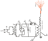 Устройство катушки Теслы предельно простое. К примеру, ещё в начале 30 годов в Ленинграде (С. Петербург) была построена такая установка на 5 миллионов вольт. Первичная обмотка имела всего два медных витка с питанием 35 киловольт, вторичная обмотка выполнена на 2000 витков сечением 0,5 мм. Ёмкость конденсатора 2 микрофарады. Установка предназначалась для ускорителя ядерных частиц. На рис. 1 показана схема устройства такой катушки Тесла, где 1 – источник постоянного напряжения, 2 – конденсатор, 3 – разрядник, представляющий собой два шарика, между которыми загорается обыкновенная электрическая дуга (как при электросварке), только слабенькая. Под цифрой 4 обозначена первичная обмотка из медной трубки,