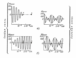 Рис.2. Осциллограммы колебаний напряжения в катушке Теслы; а) в первичной обмотке и б) во вторичной. Снято при сильной индуктивной связи (с трансформаторным железом внутри) и при слабой связи (без него).