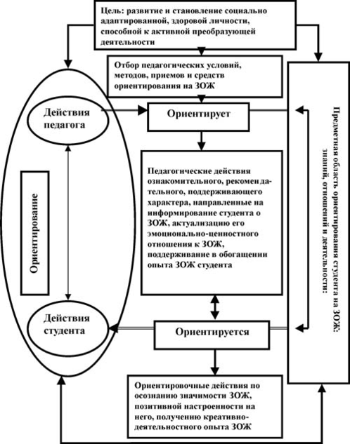 Педагогическая стратегия ориентирования студента на ЗОЖ включает в себя действия педагога ознакомительного, рекомендательного, поддерживающего характера, направленные на информирование студента о ЗОЖ, адекватное оценивание своего образа жизни, актуализацию эмоционально-ценностного отношения, активизацию здоровьесберегающей деятельности, обогащение опыта ЗОЖ. Она предполагает овладение личностью определенными способами здоровьесберегающей деятельности, приобретение и развитие необходимых качеств, способствующих организации и ведению ЗОЖ. Генеральная цель стратегии ориентирования студента на ЗОЖ обусловлена реальностью современного периода развития общества и определяется нами как развитие и становление социально адаптированной, здоровой личности, способной к активной преобразующей деятельности.