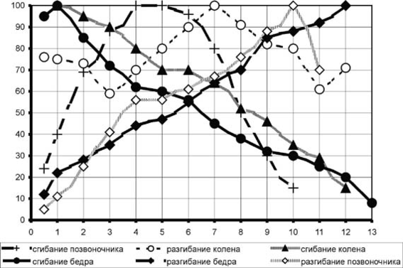 Цифровой материал иллюстрирует внутригрупповую изменчивость силы мышц в зависимости от изменения суставного угла, состояние мышц и соотношение силы сгибателей и разгибателей. Неясны причины неравномерного изменения силы мышц при равномерном изменении суставного угла в шаровидном (тазобедренном) суставе. Ряд авторов предлагают воспользоваться анализом динамики статистических характеристик. Для косвенного решения этой задачи Дж. Юна и М. Канделла (1973) анализируют динамику изменения среднего квадратичного отклонения. Ю.С. Куршакова (1965) предлагает анализировать изменение коэффициента вариации.