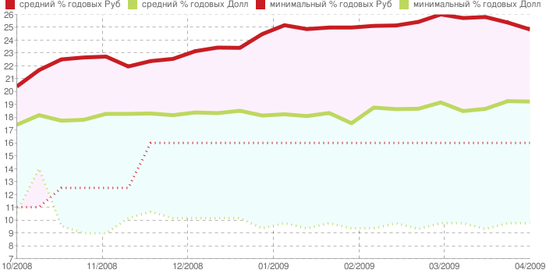 На рисунке 4 представлена динамика изменения процентных ставок по потребительским кредитам с учетом их минимального и среднего уровня, как в рублях, так и долларах США, в период с начала октября 2008 года по апрель 2009 года.