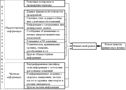 Вся доступная информация, отраженная на этой схеме, может быть условно разделена на три группы. Первую группу составляет информация о прошлой динамике курсов, то есть, исторические данные об изменении цен на различные бумаги. В совокупности с другими формами публичной информации (данными финансовой отчетности, газетными публикациями и т.п.) она включается в состав второй группы – общедоступной информации. Кроме общедоступных существуют сведения, распространяющиеся в частном порядке, как правило, это информация инсайдеров о состоянии дел в конкретной компании, ее ближайших планах и намерениях. Такие сведения формируют третий раздел классификации данных – частную информацию.