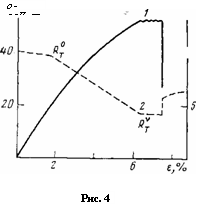 По деформационным кривым (рис. 6) трудно получить представление о возникновении повреждений и их накоплении. Деформация меняется по траекториям с малой кривизной почти пропорционально напряжению. Особенно трудно определить момент образования повреждений на началь ной стадии растяжения. С помощью акустического метода (рис. 7) можно не только выявить момент образования трещин, но и проследить кинетику их накопления. В частности, например, можно наблюдать полное или частичное «захлопывание» образовавшихся полостей при разгрузке.