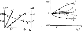 На рис. 2 представлены зависимости коэффициента ослабления продольной волны и скорости от нормированного сечения рассеяния jn. Искусственные дефекты создавались кратковременным введением иглы с боковой поверхности образца. Условия акустического контакта образца с пьезодатчиками сохранялись постоянными. Как следует из полученных экспериментальных данных, ослабление акустического сигнала возрастает прямо пропорционально Вид зависимости ослабления от частоты a~f (/ — частота) в условиях опыта соответствует области фазового рассеяния, что не противоречит соотношению X/D~l (X — длина волны, D — диаметр частиц наполнителя). Казалось бы, повышая частоту, можно обнаружить минимально возможный дефект. Однако сильное ослабление затрудняет работу на частотах выше 3 МГц. Максимальное уменьшение скорости распространения продольной волны при условиях опыта составляет 60 м/с. При разрывных деформациях эта величина оказывается на порядок больше, что может свидетельствовать о существенно большей величине ^к перед разрушением.