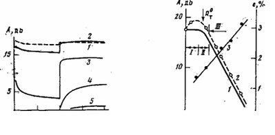 Процессы ориентации должны вызывать уменьшение коэффициента ослабления и увеличение скорости в направлении растяжения [11]. В условиях эксперимента разница скоростей в направлении параллельном и перпендикулярном оси растяжения составила 9 м/с, максимальное уменьшение ослабления 1,3 дБ (что превышает ошибку измерений). Учет ослабления, вызванного ориентацией, позволяет выделить часть величины коэффициента ослабления, обусловленную накоплением повреждений (рис. 8, кривая 1). Инкубационная I и переходная II области характеризуются слабой зависимостью от напряжения. Для области III основного периода медленного роста трещин наблюдается прямолинейная зависимость ослабления от напряжения. Вид зависимости A~f(a) соответствует закону накопления повреждений. Воспользуемся установленной в модельном эксперименте связью акустических величин с сечением дефектов и перейдем от изменения амплитуды акустического сигнала к эффективному сечению рассеяния. Для области III yN=k-E, где /с=0,12 в режиме разгрузки при 20°, причем появлению дефектов сечением 1 см2 соответствует изменение амплитуды акустического сигнала на 0,5 дБ.